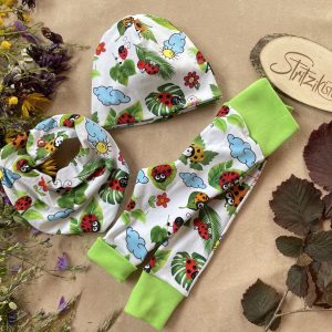 Babyset bestehend aus Mütze, Halstuch und Hose in der Größe 62.