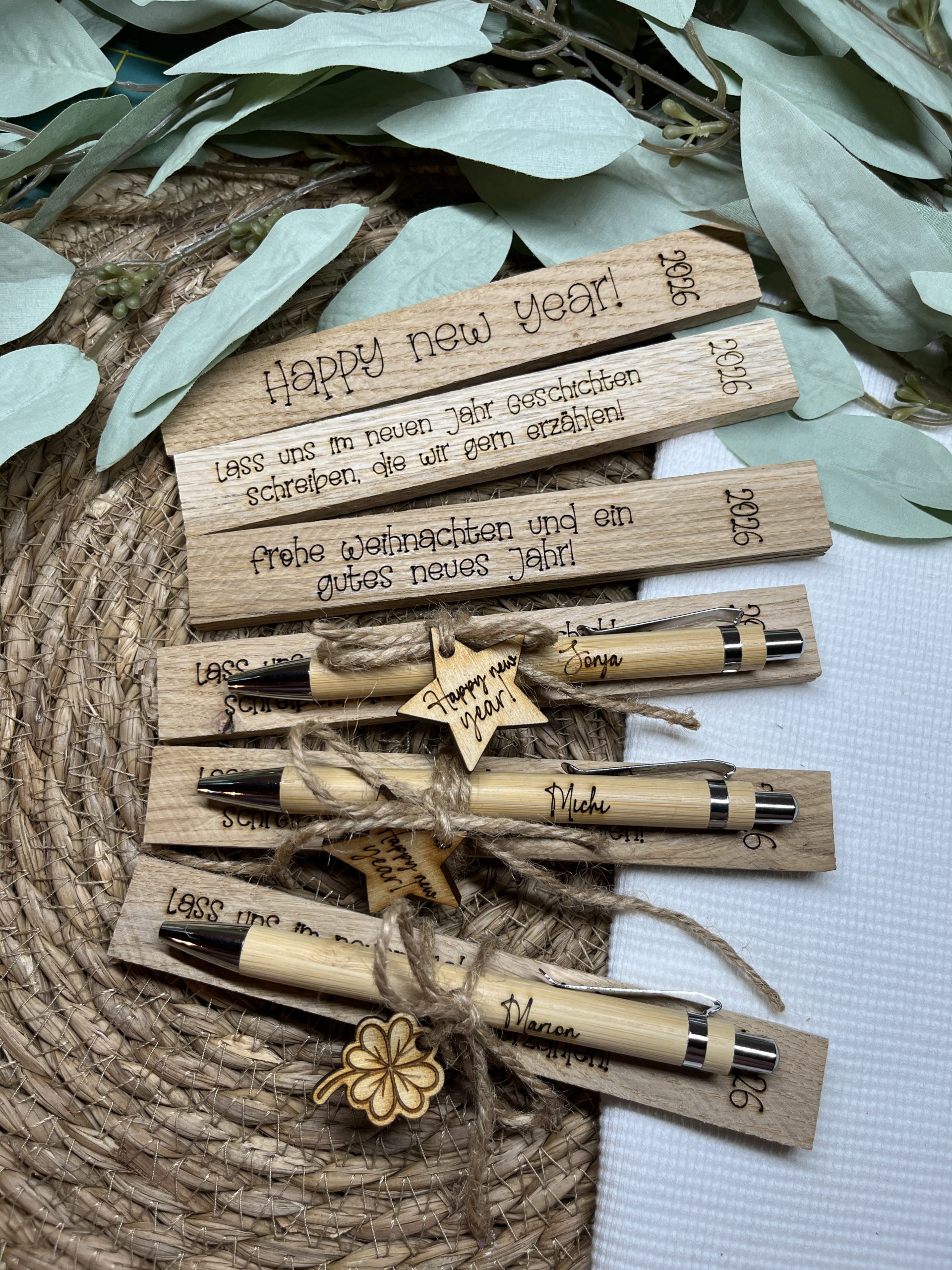 Klötzchen graviert mit kleinen Glücksbringer und personalisiertem Kuli.