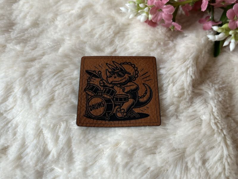 Lederlabel „Triceratops am Schlagzeug“ – Einzigartiges Design für Ihre DIY-Projekte