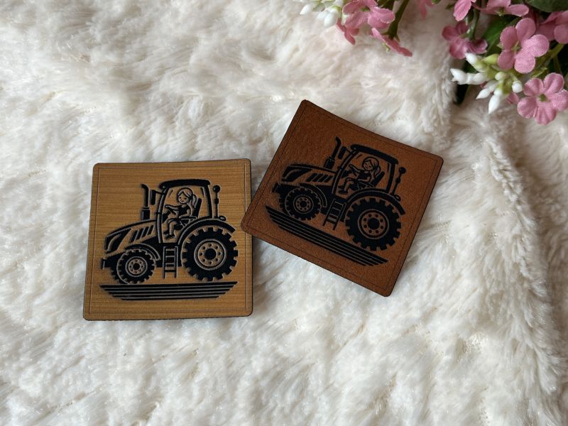 Weiches Lederlabel mit Mäderl auf Traktor