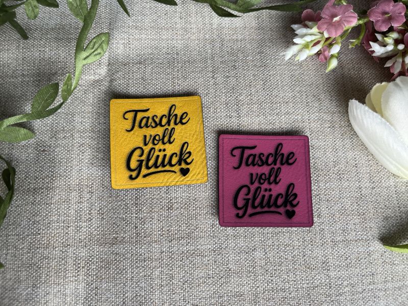 Dieses 4×4 cm große Label aus weichem Kunstleder bringt gute Laune direkt auf deine selbstgemachte Tasche! Der freche Spruch „Tasche voll Glück“ zaubert garantiert ein Lächeln – perfekt für Nähprojekte mit Herz und Humor.