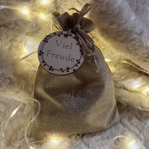 Die Lieferung erfolgt im Leinensackerl, auch eine tolle Geschenkidee für Bastelfreunde. Das Plättchen am Sackerl kann personalisiert werden.